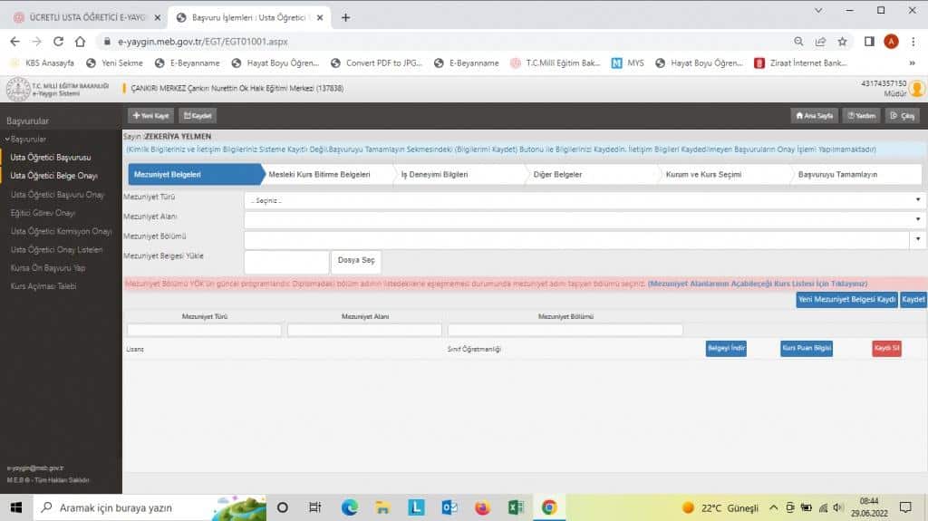Başvuru işlemleri 01.08.2025 – 31.08.2025 tarihleri arasında Ek-2 Ücretli Usta Öğretici Başvuru Değerlendirme Formuna esas belgeler ile e-yaygın sistemi üzerinden yapılacaktır.